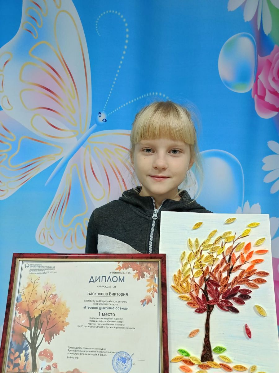 Наша воспитанница Баскакова Вика приняла участие во Всероссийском детском творческом конкурсе поделок "Первое дыхание осени" и заняла первое место со своей работой "Осенний ветер" в стиле квиллинг. Работа с бумажными полосками требует аккуратности, усидчивости и фантазии. Девочка со старанием и увлечением занимается в кружке по квиллингу "Бумажная филигрань" и получает массу положительных эмоций от творческого процесса.